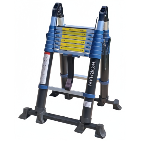 La nouvelle alternative aux échelles conventionnelles, l'échelle télescopique à de nombreuses applications à la fois pour l'utilisation domestique et pour les professionnels. Grâce à sa conception unique, l'échelle s'ouvre et se ferme "étape par étape", pouvant être utilisée à des hauteurs allant jusqu'à 5m. Vous ouvrez donc uniquement à la hauteur nécessaire, ce qui permet une grande maniabilité, en particulier dans les petits espaces. Repliée, l'échelle est extrêmement compact et facile à transporter (95cm x 48cm repliée). Avantages de l’échelle Multi-fonctions: *Capacité de poids jusqu'à 150 kg. *Fabriquée selon la norme européenne EN131. *Fabriquée à partir d'aluminium de haute qualité combiné avec stabilisateur créant ainsi un produit assurant une très grande stabilité lors de l'utilisation. *Possibilité de modifier la longueur ou la hauteur de travail rapidement, les plier en deux, ou ajuster la longueur de chaque pieds ce qui les rend également idéales pour l'utilisation sur des escaliers ou des surfaces inégales. *Pieds avec tampons en caoutchouc robustes assurant une résistance supérieure à l'usure et ne laissant pas de rayures sur les surfaces de travail. *Mécanisme de blocage ajoutant une sécurité supplémentaire et de la rigidité à l'échelle lors de son utilisation.