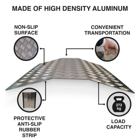 MARQUE ALLEMANDE. Cette rampe simplifiera le franchissement d'obstacles tels que : seuils hauts, fils, tuyaux et autres endroits qui empêchent le déplacement pratique des hommes ou de la cargaison. Fabriquée selon les normes EN-131 et CE. Les points d'appui de la rampe à chaque extrémité sont équipés d'une protection pour éviter de rayer le sol. Aucun assemblage n'est nécessaire. Idéal pour se déplacer confortablement en fauteuil roulant, scooter, brouette, etc., etc. Une construction simple et durable en aluminium anodisé qui ne rouille pas. Facile à retirer selon les besoins. La surface antidérapante de la rampe assure la sécurité des utilisateurs.