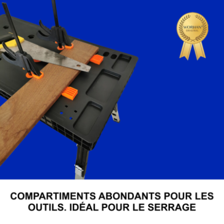 Nombreux emplacements intégrés pour vis, écrous, chevilles et aussi pour divers outils : tournevis, pinces, etc etc. Règle (sur 2 côtés) et rapporteur sont gravés sur la surface de travail.