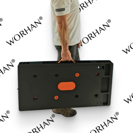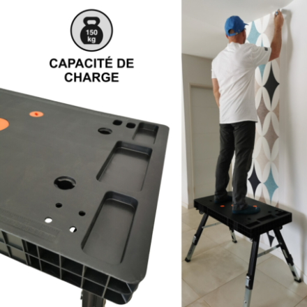 3 hauteurs de travail réglables : a) 80cm., b) 66cm., et c) 52cm., Capacité de charge: 150kg, Poids: 15kg, Taille dépliée : 129cm x 59cm x 80cm, Taille pliée : 94cm x 48cm x16cm,